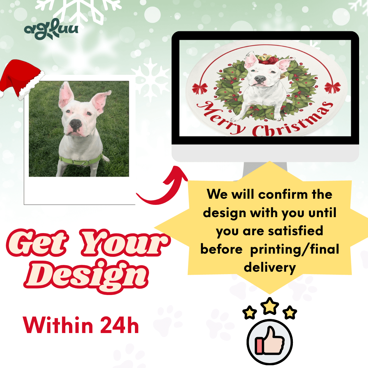For the best results, please upload a high-resolution photo of your pet with good lighting. Make sure their face is clearly visible and not blurry or cropped. We'll provide guidelines through rendering on each product page regarding ideal photo types.